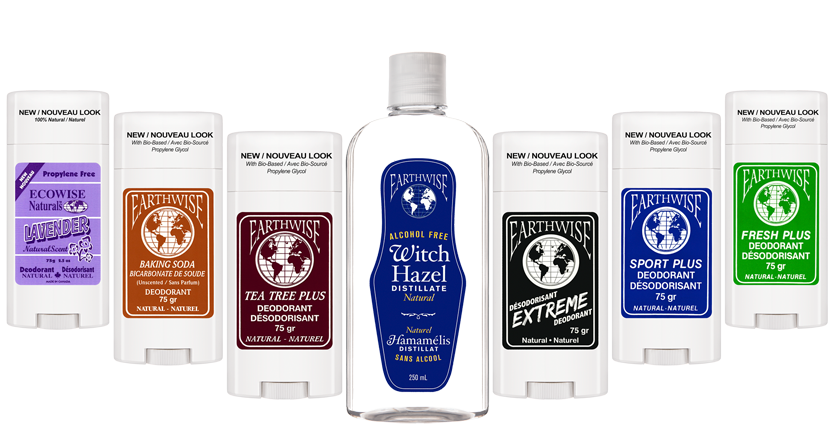 Earthwise Natural Deodorants are free of aluminum, parabens, triclosan, colourants and are made with bio-based (vegetable glycerin derived) propylene glycol. Our Eco-Wise Naturals line also offers a 100% natural Lavender Deodorant made with vegetable glycerin.